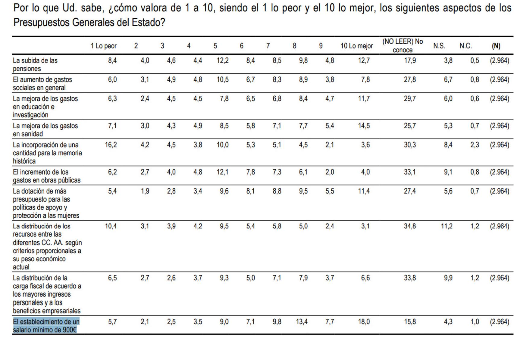 En el apartado “cómo valora de 1 a 10, siendo el 1 lo peor y el 10 lo mejor, los siguientes aspectos de los Presupuestos Generales del Estado?”, se pregunta sobre el establecimiento del salario mínimo de 900 euros que es, de lejos, la medida mejor valorada por los españoles.