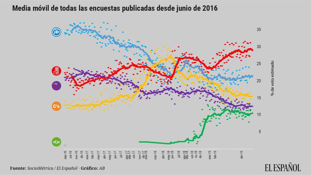 La caída en picado de Unidas Podemos -recién frenada- y el auge de Vox camino del sorpasso a Iglesias también pueden detectarse en un gráfico mucho más amplio, el del promedio de las encuestas desde junio de 2016.