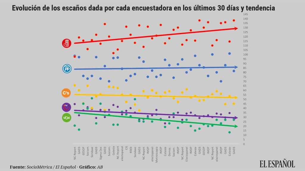 A pesar de una leve caída durante la última semana, el voto del PSOE para las elecciones del próximo 28 de abril parece haber encontrado acomodo en torno al 30%. Un porcentaje que, traducido a escaños, supone una horquilla de entre 124 y 130. Según el tracking electoral realizado por SocioMétrica para este periódico, Pedro Sánchez merodea esas cifras desde mediados de marzo y camina hacia una cómoda victoria, ya ninguna formación parece amenazarlas.