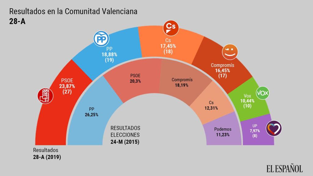 Los socialistas se han impuesto con 27 asientos en el parlamento (cuatro más que en 2015); seguidos por los 'populares', con 20 (11 menos); Cs, con 18 (cinco más); Compromís, con 16 (tres menos); Vox, con diez, y Unidas Podemos, con ocho representantes (cinco menos) imprescindibles para la mayoría de la izquierda en el hemiciclo.