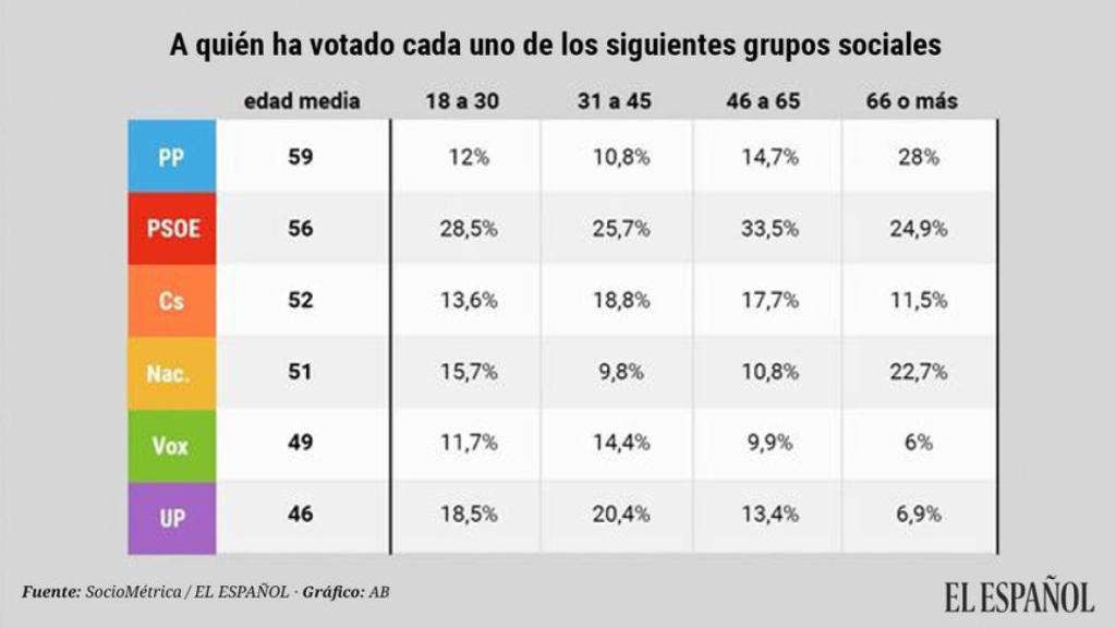 Según el mencionado análisis, que ajusta el resultado electoral con el tracking de las últimas encuestas publicadas el día de las elecciones, la media de edad de los votantes que apostaron por la lista de Pedro Sánchez se sitúa en los 56 años. La del Partido Popular asciende a los 59 años; la de Cs se queda en los 52; la de Vox en los 49 y la de Unidas Podemos es la más joven de todas, se queda en los 46.