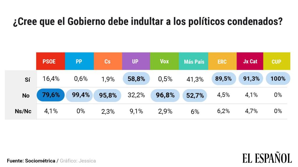 Si bien existe un abrumador rechazo al indulto entre las filas del PSOE, aparece el 16,4%, que considera que el secretario general de su partido y presidente en funciones del Gobierno debería otorgarle la medida de gracia a los dirigentes independentistas.