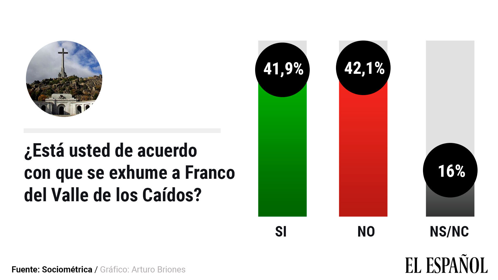 La exhumación de Francisco Franco divide a España en dos. El empate entre partidarios y detractores es casi absoluto. Así se desprende del último sondeo realizado por SocioMétrica para EL ESPAÑOL. Un 41,9% se muestra a favor y un 42,1% lo hace en contra. Un 16% no sabe o no contesta.