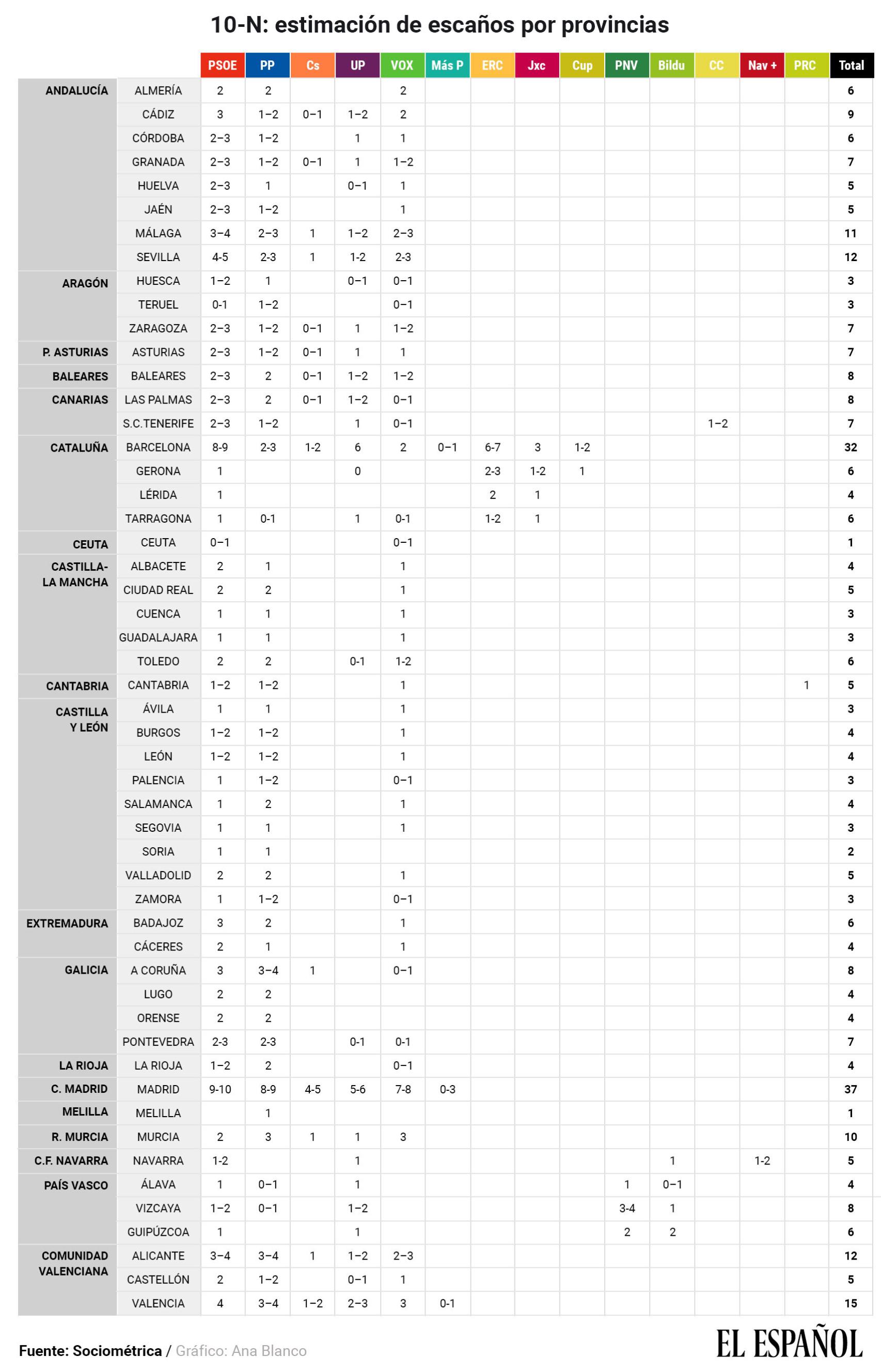 En cuanto a Cataluña, el ganador, aunque con un leve retroceso sería ERC, con entre 11-14 escaños. En abril obtuvo 15. La razón estriba en la irrupción de la CUP (2-3) . El PSOE, por su parte, retendría sus 12 escaños, aunque estaría a punto de dejarse uno (11-12), según SocioMétrica. Ciudadanos sería el gran perjudicado, ya que pasaría de 5 a 1-2 representantes, mientras que Vox pasaría de 1 a 3-4 y los de Pablo Casado de su único diputado, Cayetana Álvarez de Toledo, a los 2-4 escaños. La formación de Pablo Iglesias, que obtuvo 7 actas, las mantendría, a pesar de la irrupción de Más País (0-1).
