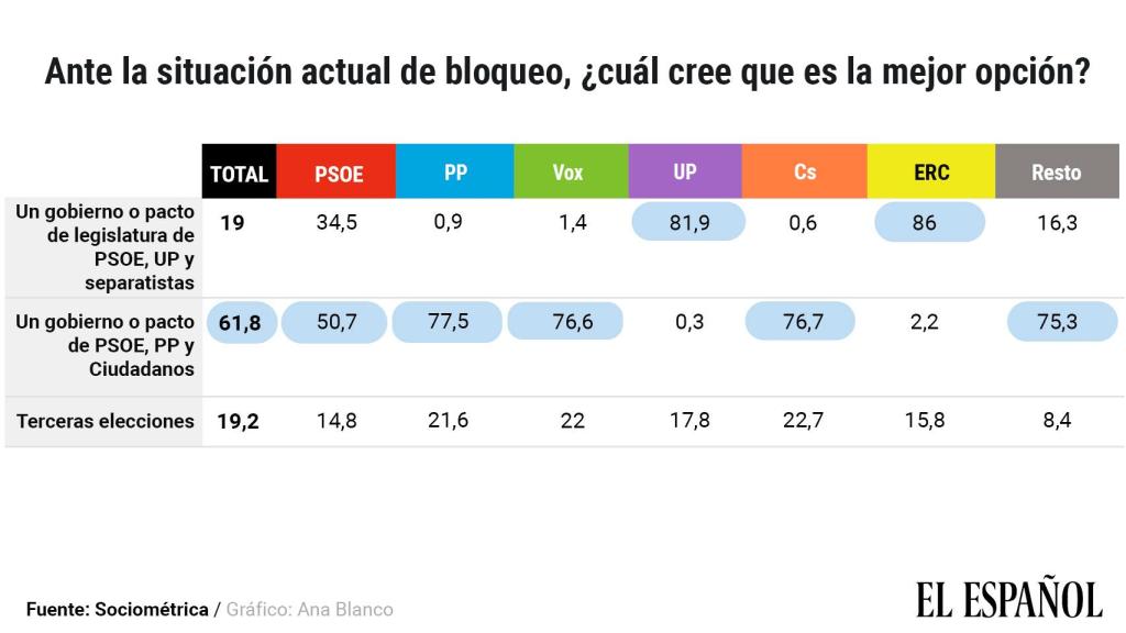 En todo caso, para los votantes de estas formaciones la segunda opción si esto no ocurre es la nueva convocatoria a las urnas, opción que eligen uno de cada cinco de sus votantes.