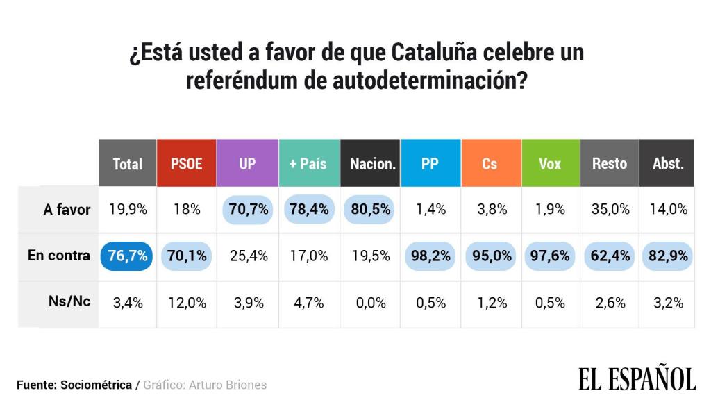 La tónica se repite en todas y cada una de las exigencias independentistas, pero quizás la más acusada sea con respecto al referéndum de autodeterminación. El 70,7% de los morados está a favor y tan sólo un 25,4% en contra. Los votantes socialistas lo respaldan en un exiguo 18%, frente al rechazo de plano del 70,1%.
