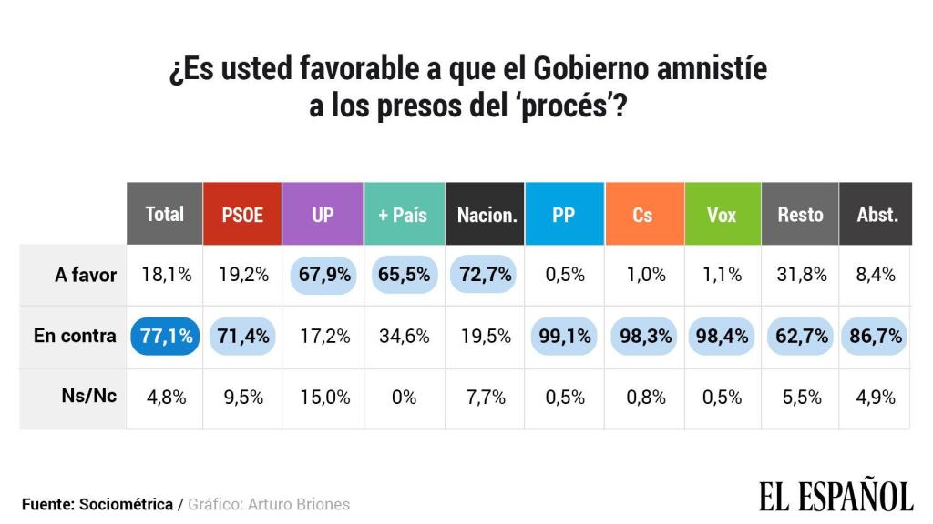 El fenómeno se repite cuando se cuestiona sobre la amnistía a los condenados. El 67,9% de los simpatizantes de Iglesias se muestra favorable a que el Gobierno les indulte, frente a un 17,2% que no lo ve con buenos ojos. Los votantes socialistas vuelven a ser radicalmente opuestos: el 71,4% no quiere ni oír hablar del tema y únicamente el 19,2% se mostraría a favor de que se les diera esta medida de gracia.