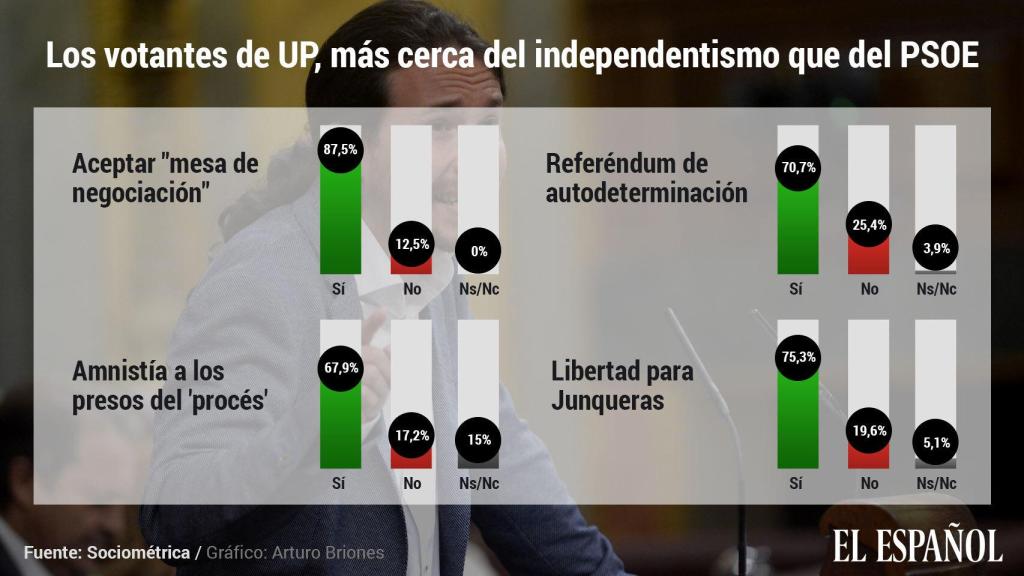 Preguntados los votantes confederales sobre si Pedro Sánchez debe aceptar "una mesa de negociación" sobre el "conflicto político" entre Cataluña y "el Estado", como exige ERC, los electores de Iglesias creen que sí en un 87,5%. Es una cifra superior incluso a la que viven los nacionalistas, que se inclinan por el sí en un 80,4%. En cambio, los socialistas, aunque divididos, lo rechazan mayoritariamente, con un 51%.