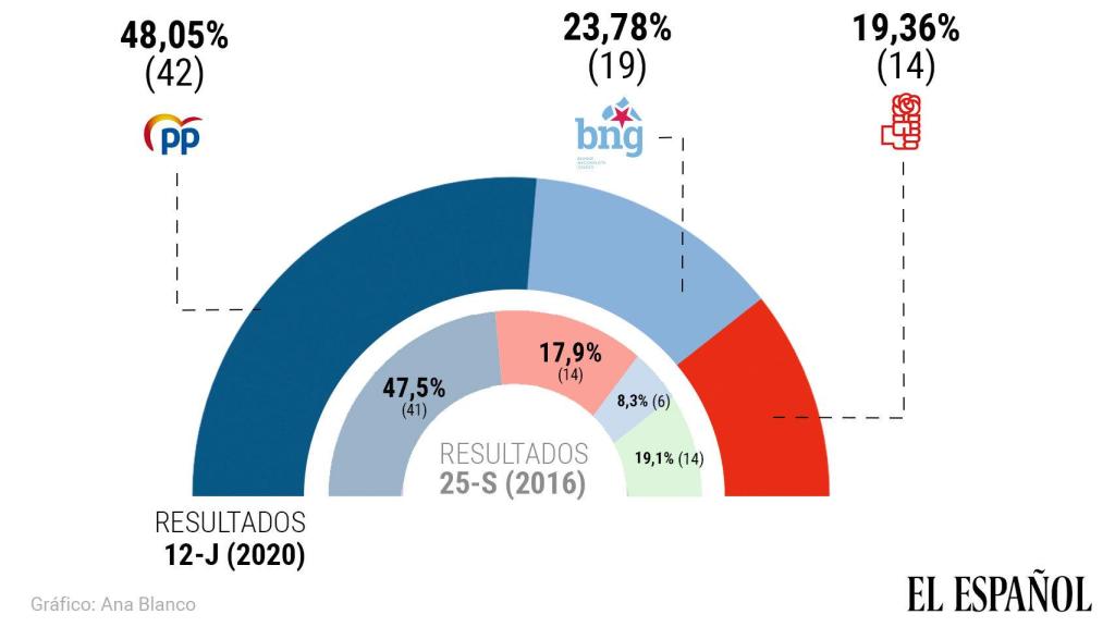 Al final, el descalabro de Podemos y el subidón de los galleguistas del BNG ha cambiado el mapa de la Cámara gallega por completo: serán sólo tres los colores de los grupos políticos que conformen el Parlamento regional en la legislatura 2020-2024, es decir, los populares, el Bloque Nacionalista Galego (BNG) y los socialistas del PSdeG.