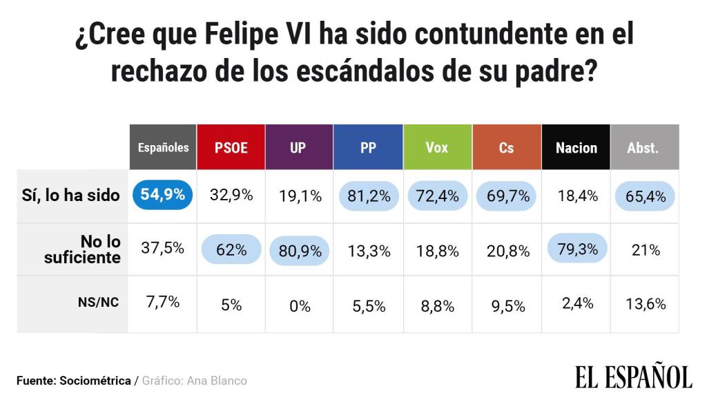La división ideológica es patente en este caso también, ya que el 81,2% de los seguidores del PP, el 72,4% de los de Vox y el 69,7% de los de Ciudadanos vieron contundencia en el rechazo de Don Felipe a los escándalos de su padre.