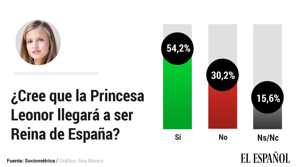 La Corona ha salido reforzada a pesar de las polémicas y la campaña política en su contra, y así lo demuestran los datos de la encuesta de SocioMétrica para EL ESPAÑOL. Según el sondeo, el 54,2% de los consultados cree que la hija mayor de Don Felipe y Doña Letizia llegará a ser Reina de España.