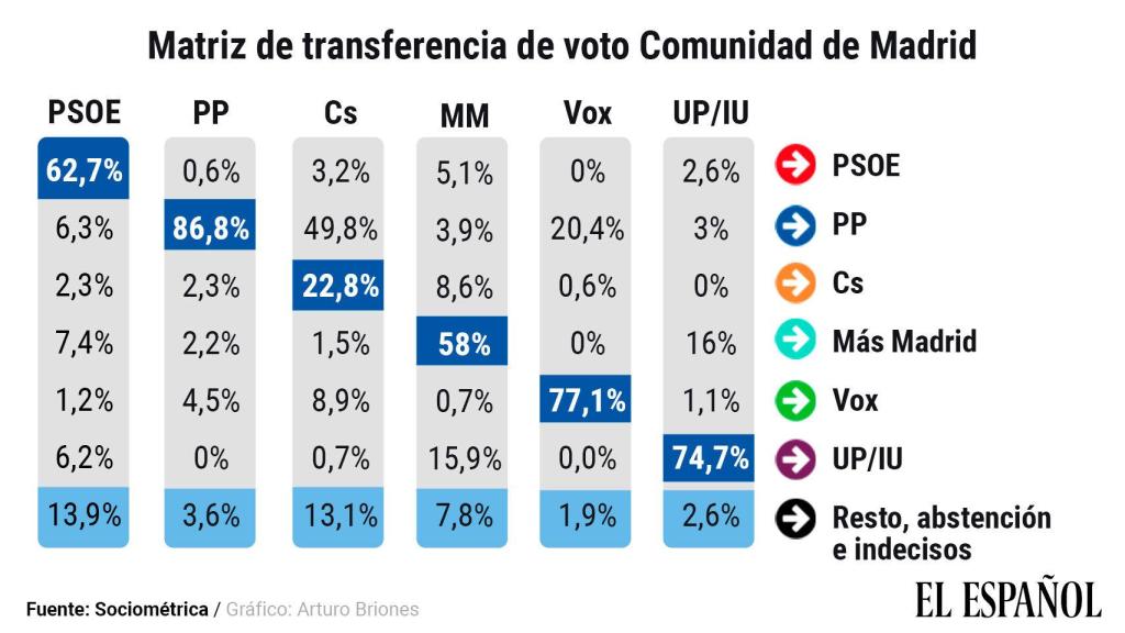 La encuesta de SocioMétrica también muestra la transferencia de voto entre los distintos partidos. En este sentido, lo más llamativo es cómo el 49,8% de quienes votaron a Ciudadanos en 2019, emigraría hoy al Partido Popular. Una cifra que sigue aumentando -la semana pasada era del 48%- a pesar de la elección de Edmundo Bal como nuevo candidato liberal, en detrimento de Ignacio Aguado.