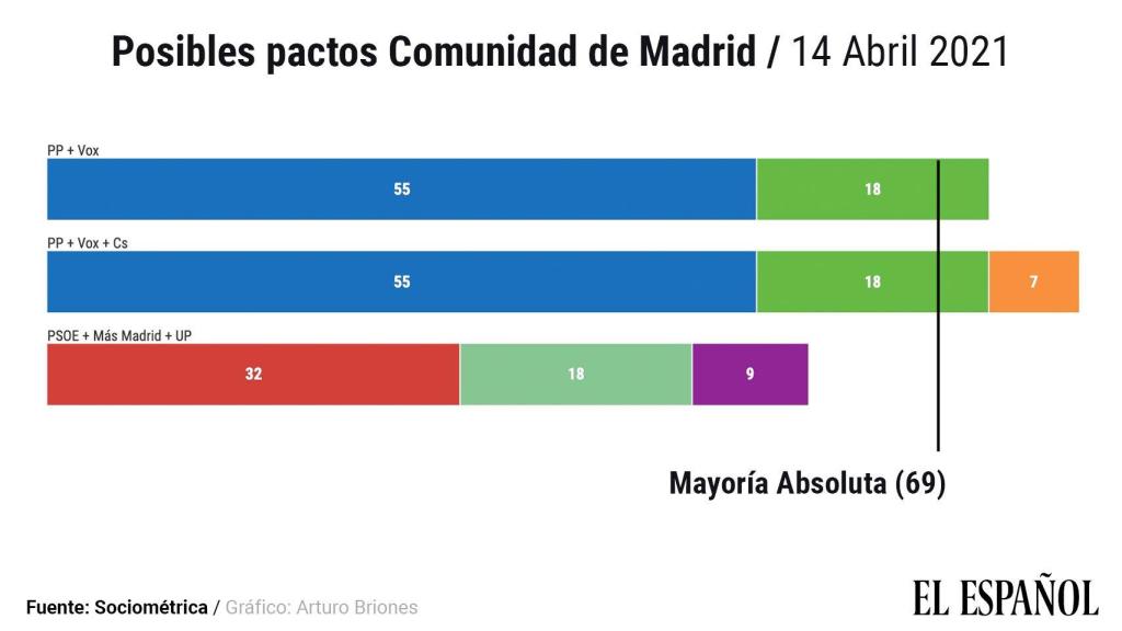 Así las cosas, un hipotético bloque del centro-derecha conformado por PP, Vox y Ciudadanos superaría holgadamente la mayoría absoluta (77 escaños). Pero en el hipotético caso de que los liberales no alcanzaran el umbral del 5%, Ayuso también tendría asegurada la investidura (sumaría 74 diputados con Vox). La izquierda no podría, en ningún caso, conformar una mayoría alternativa.