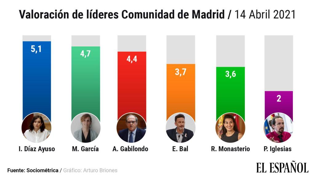 Completan el ranking Edmundo Bal (Cs) y Rocío Monasterio (Vox), con un 3,7 y un 3,6, respectivamente. En último lugar, Pablo Iglesias (Unidas Podemos), que sólo obtiene un 2.