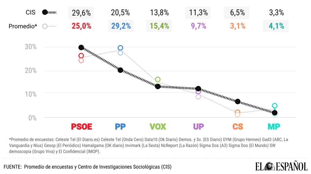 Atiéndase, sin ir más lejos, a la última encuesta confeccionada por SocioMétrica para EL ESPAÑOL, publicada el pasado 1 de agosto. Ésta daba como ganador de las próximas elecciones al PP con un 26,4% -casi seis puntos más de lo que le concede el CIS- y dejaba atrás a los socialistas con un 24,7% de los apoyos -cinco menos de lo que le otorga Tezanos en su última encuesta-.