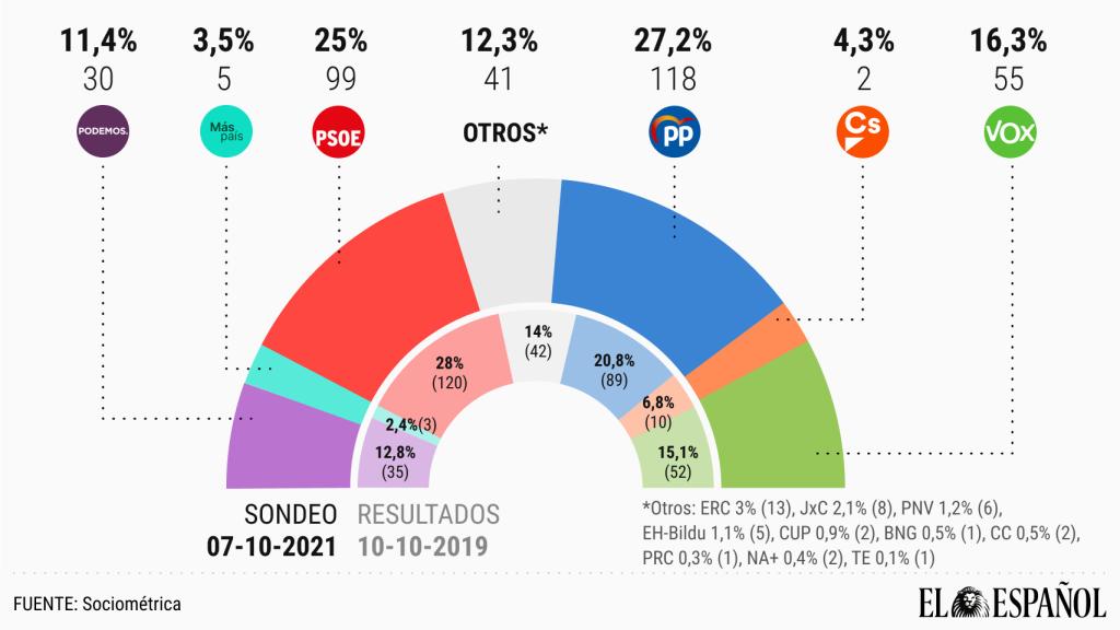 El PP lograría ahora el 27,2% de los votos, frente al 25% del PSOE, que se quedaría en 99 diputados, 21 menos que en los pasados comicios. Transcurrida apenas la mitad de la actual legislatura, la coalición de Gobierno entre PSOE y Unidas Podemos habría pasado de 155 escaños a 129, lo que da cuenta de su desgaste tras la pandemia.