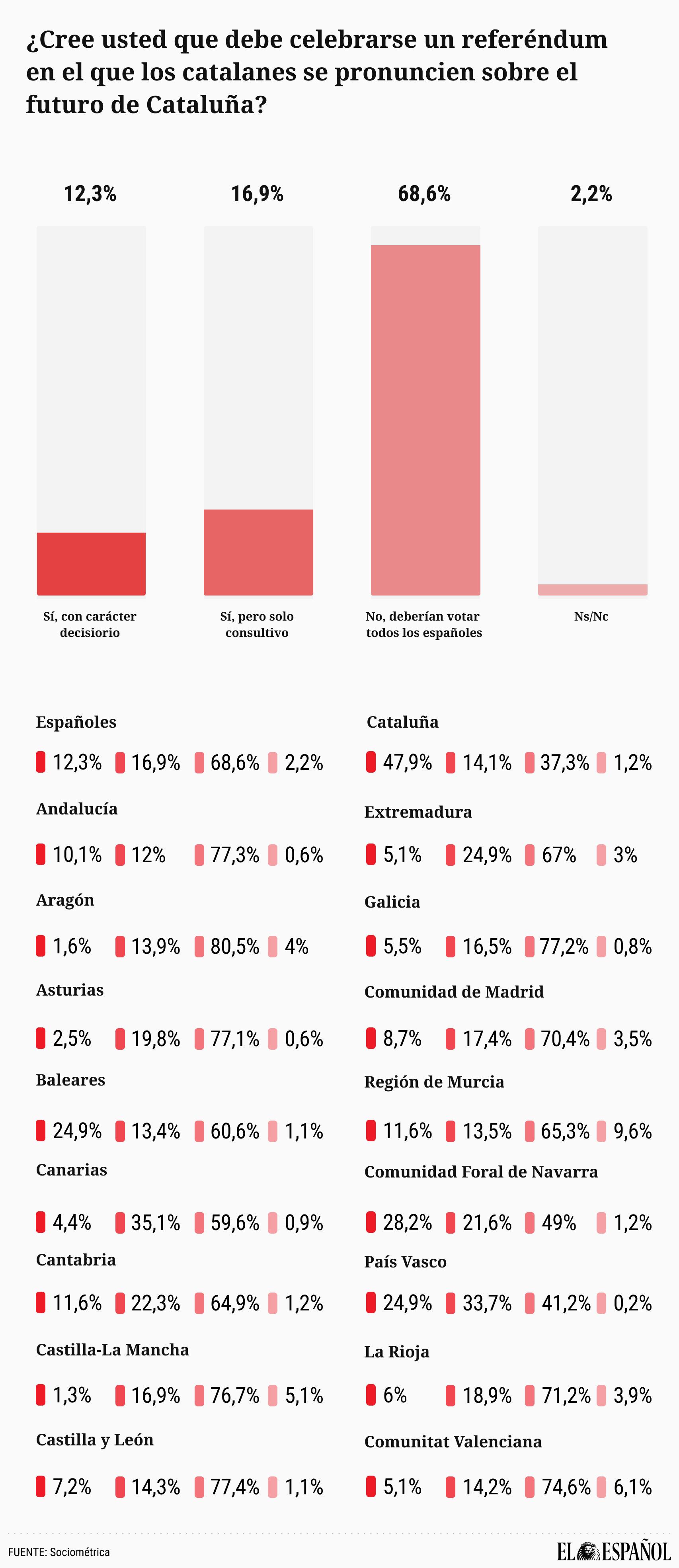 Los porcentajes son muy similares en el resto de España. No baja del 65% la proporción de encuestados que reclamaría una votación a nivel nacional, salvo en el País Vasco (41,2%), Navarra (49%), Canarias (59,6%) y Baleares (60,6%).