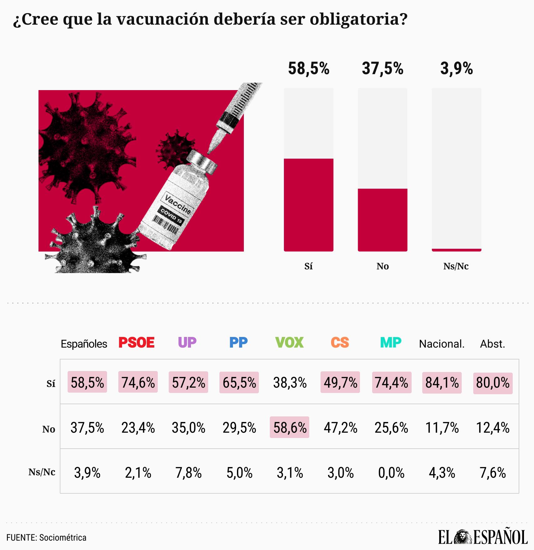 También hay diferencias significativas por adscripciones políticas, ya que parece existir cierta correlación entre ser de izquierdas y apoyar las imposiciones. Los más partidarios de la inoculación por norma son los votantes de PSOE (74,6%) y Más País (74,4%), sólo por detrás de los nacionalistas (84,1%), mientras que los de Ciudadanos (49,7%) y Vox (38,3%) son los más reacios. Populares (65,5%) y podemitas (57,2%) también se muestran favorables.