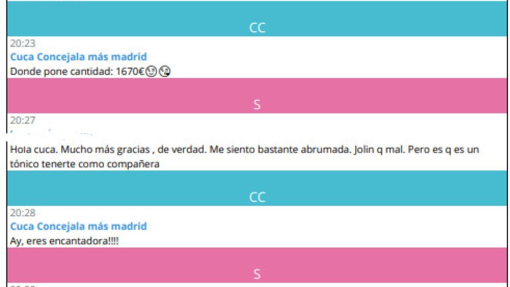 La siguiente conversación, que data del 26 de diciembre de 2019, está reproducida con alguna corrección que facilite su lectura. La mantiene Cuca Sánchez, edil de Más Madrid, con una asesora de la formación, no afiliada, a través de la plataforma Telegram.