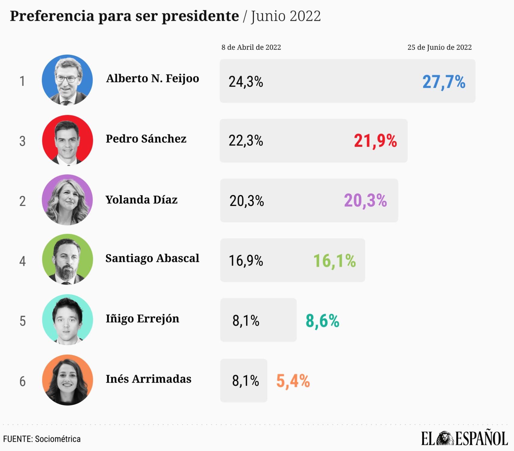 Ficha técnica: La encuesta de SocioMétrica para EL ESPAÑOL ha sido realizada a través de 1.200 entrevistas en toda España, extraídas mediante cuotas prefijadas y cruzadas de sexo, edad y comunidades autónomas, de forma mixta CATI y CAWI, mediante plataforma Gandia Integra, entre los días 21 y 24 junio de 2022.