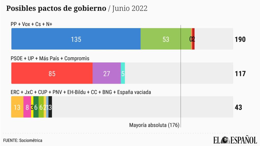 La única oportunidad de Sánchez sería que Vox no apoyase al PP y volver a reconstruir la denominada alianza Frankenstein, con Unidas Podemos, Más País, los independentistas de ERC (que obtendrían los mismos 13 escaños que en 2019), Junts (que repetiría con 8), PNV (6) y Bildu (6).