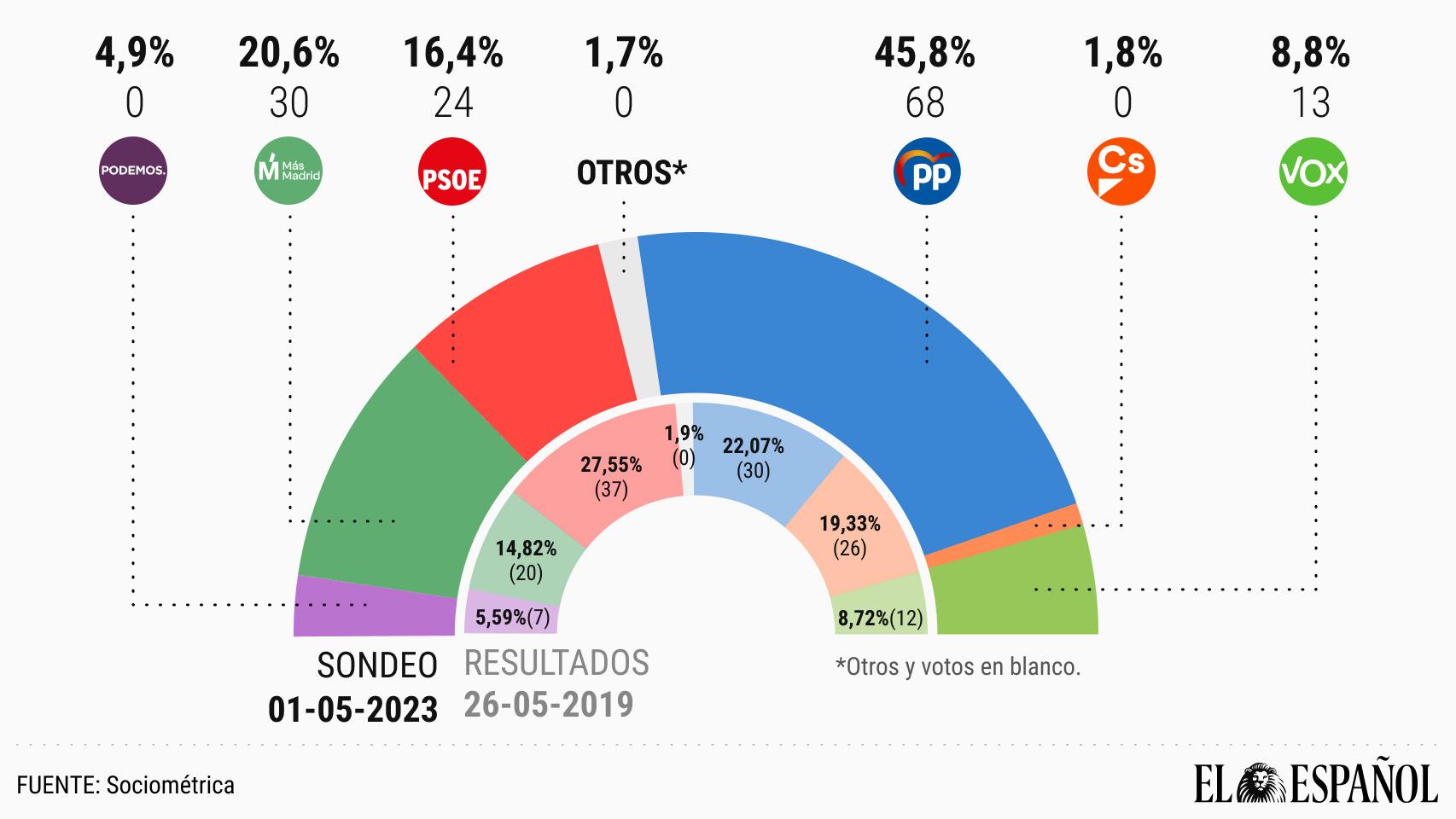 Este dato es especialmente significativo, ya que la entrada o no de la formación morada en la Asamblea regional determina en buena parte la mayoría absoluta de Ayuso. Debido al reparto de escaños, la desaparición de Podemos es la clave para que el PP ascienda a 68 diputados, donde está fijada la mayoría absoluta.
