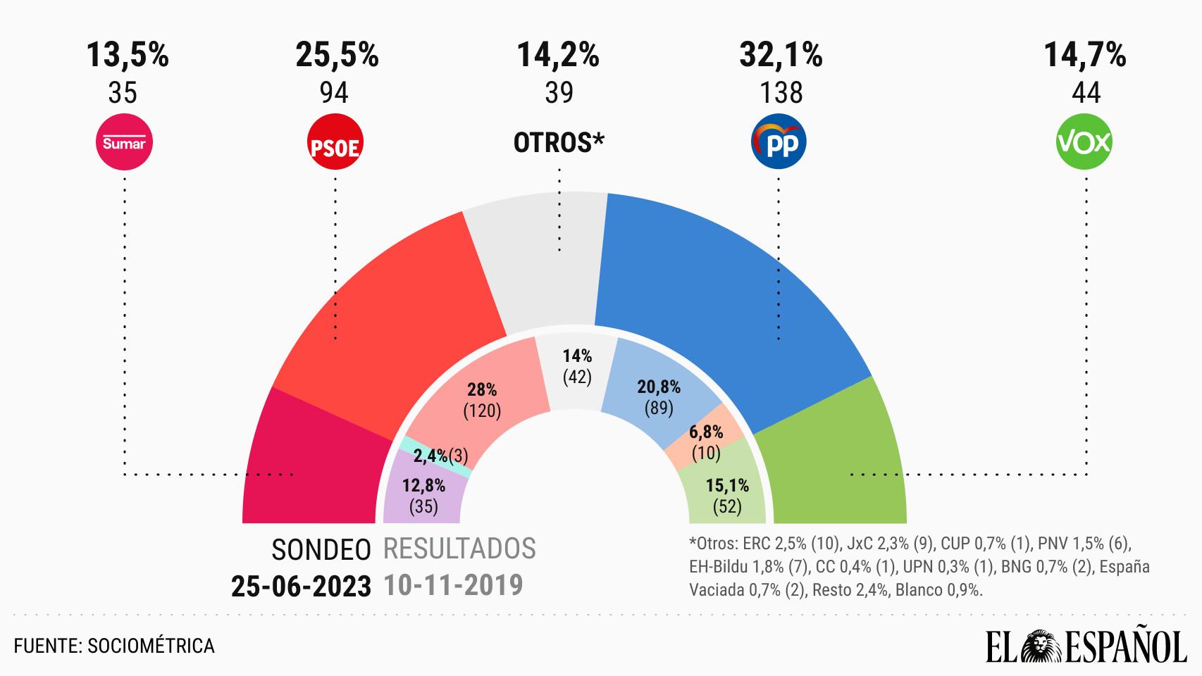 Este brevísimo retroceso de la derecha sigue siendo minúsculo a efectos electorales. Tanto es así que el PP, a pesar de haber perdido intención de voto en la última semana (de 32,6% a 32,1), ha subido tres escaños. Con Feijóo intentando no depender de Vox para formar Gobierno, la ecuación ya no se mide en si "PP y Vox suman mayoría", como hacíamos tras el 28-M, sino en si el PP podrá llegar a la Moncloa por su cuenta.