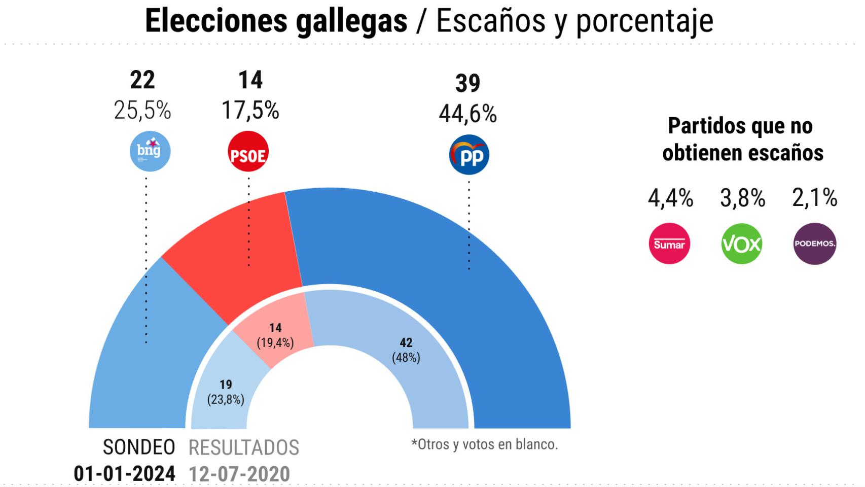 Ni Sumar ni Podemos lograrían ni un solo asiento en el Parlamento gallego. Con un 3,8% de las papeletas, tampoco lo conseguiría Vox, lo que supone un alivio para un PP que lograría la mayoría absoluta ajustada, de tan sólo un escaño por encima.
