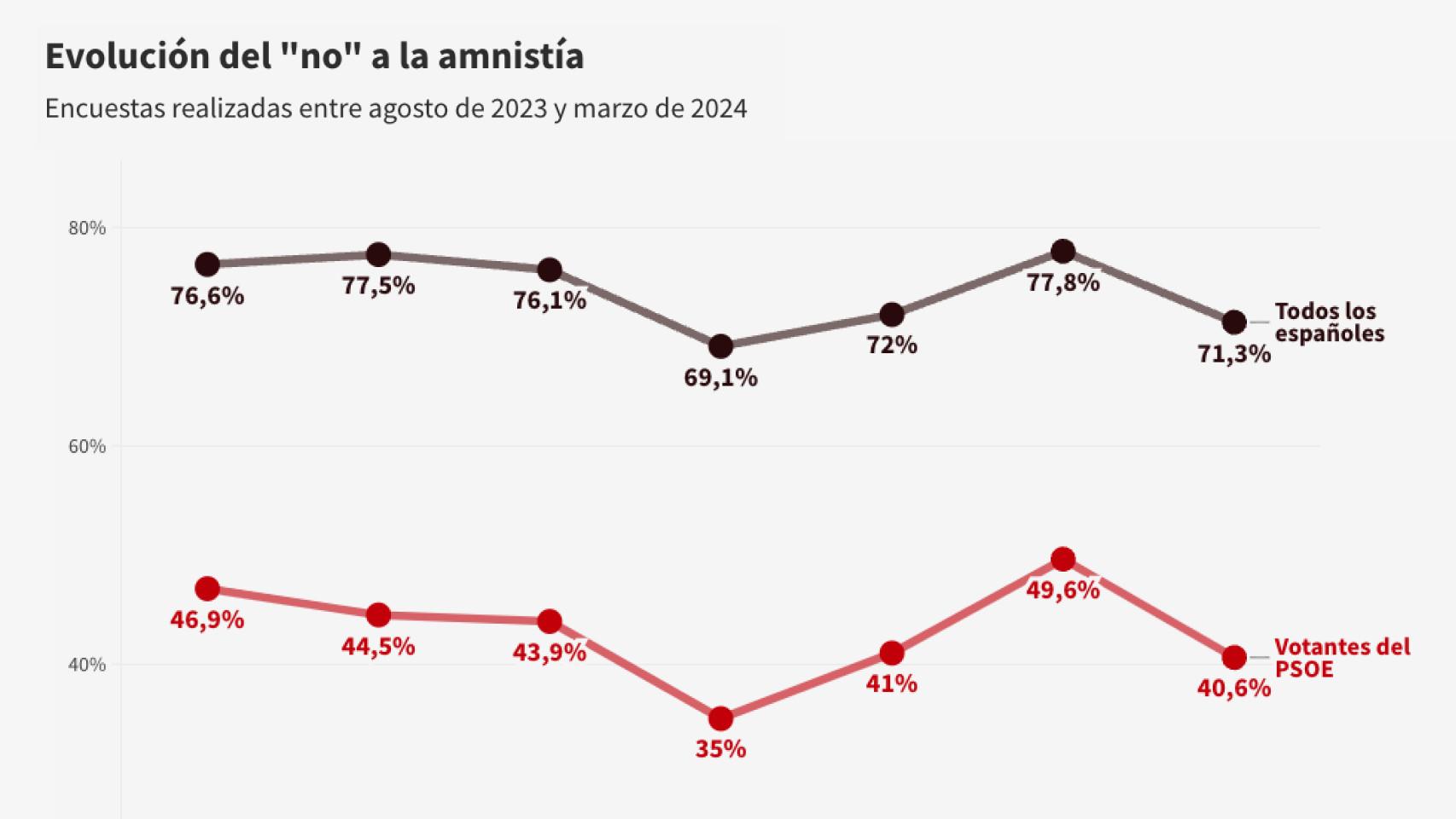 En cualquier caso, el "no" a la amnistía y a las cesiones al independentismo se ha tomado un ligero respiro desde las elecciones gallegas, aunque sin llegar a mínimos. A Pedro Sánchez todavía le queda un largo camino para empezar a convencer a la mayoría de votantes de su partido.