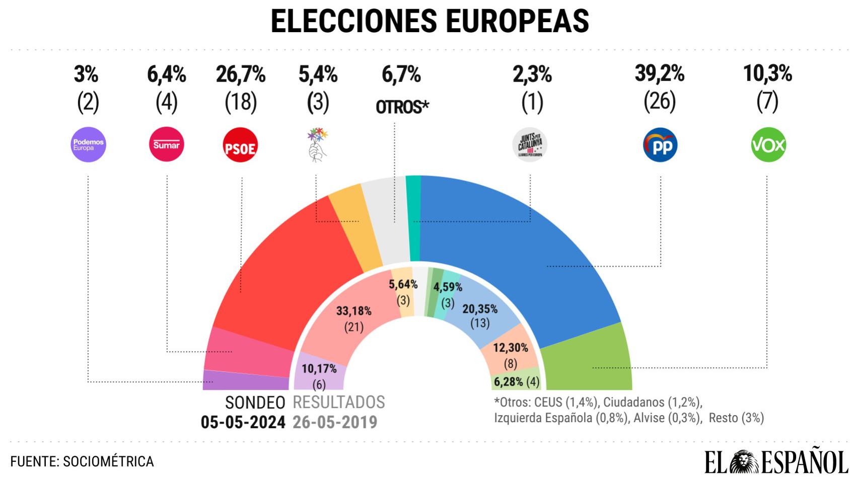 De esta forma, los populares lograrían doblar su representación en el Parlamento Europeo con relación a la última cita de 2019, pasando de 13 a 26 asientos. Los socialistas, a sensu contrario, retrocederían posiciones: de 21 a 18 eurodiputados. Así se desprende del último sondeo elaborado por SocioMétrica para EL ESPAÑOL.