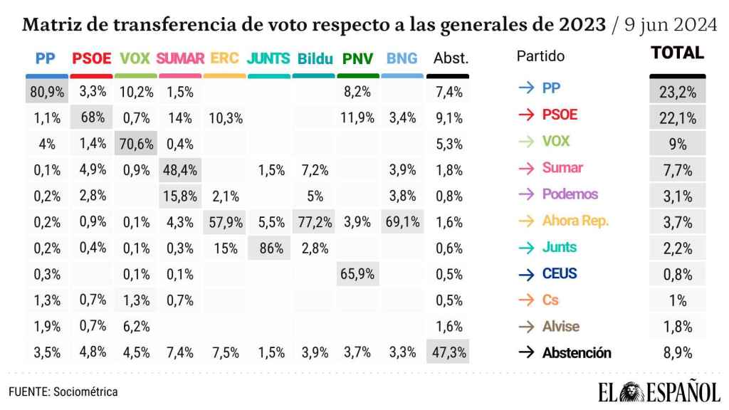 Según el sondeo de SocioMétrica, el resultado del PP es 1,45 puntos superior al que obtuvo en las generales del pasado 23-J. Esto es gracias a que ha mantenido la mayor fidelidad de voto, con el 80,9% de los que votaron a Feijóo en las generales eligiendo la misma papeleta y consigue robar a otras formaciones como Vox (10,2%) o incluso el PNV (8,2%).