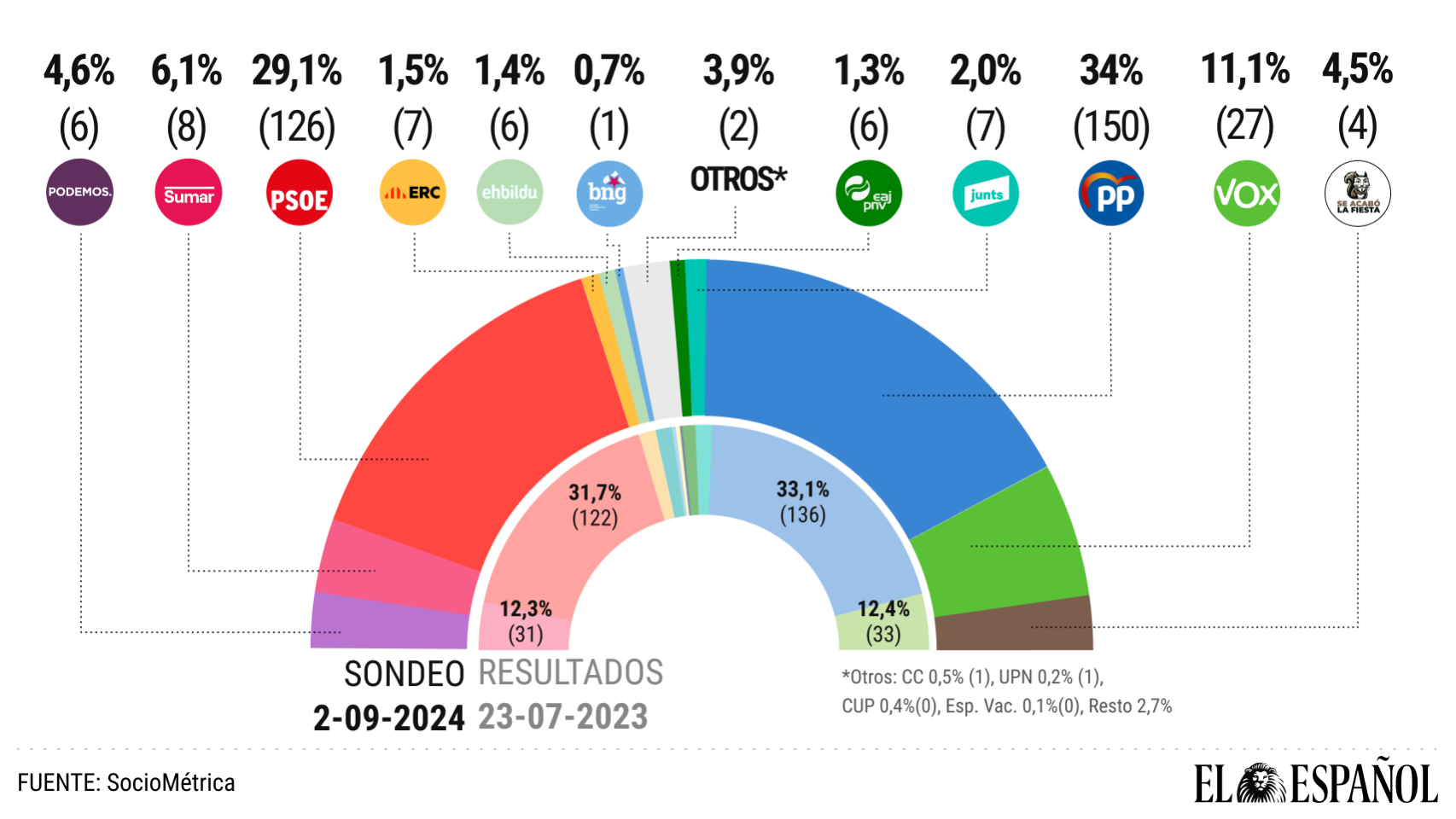 Así lo revela el último barómetro de SocioMétrica, cuya tercera parte publica hoy EL ESPAÑOL. Un panorama en el que el PP de Alberto Núñez Feijóo crecería hasta los 150 escaños, más que la suma de PSOE y Sumar. Vox, por su parte, retrocedería hasta los 27 diputados.