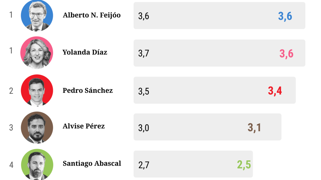 Estos datos, no obstante, hay que cogerlos con ciertos matices, dado que todos los líderes nacionales han bajado su popularidad drásticamente desde inicios de año. Díaz ha pasado de rozar el 40% a estar por debajo del 30%, igual que Sánchez; Feijóo superaba el 35% y ahora no alcanza ni el 28%; y Abascal ha caído desde el 27% hasta su actual 19,3%. Las valoraciones de Alvise Pérez, por su parte, no existían hasta hace un mes, y aun así han descendido.