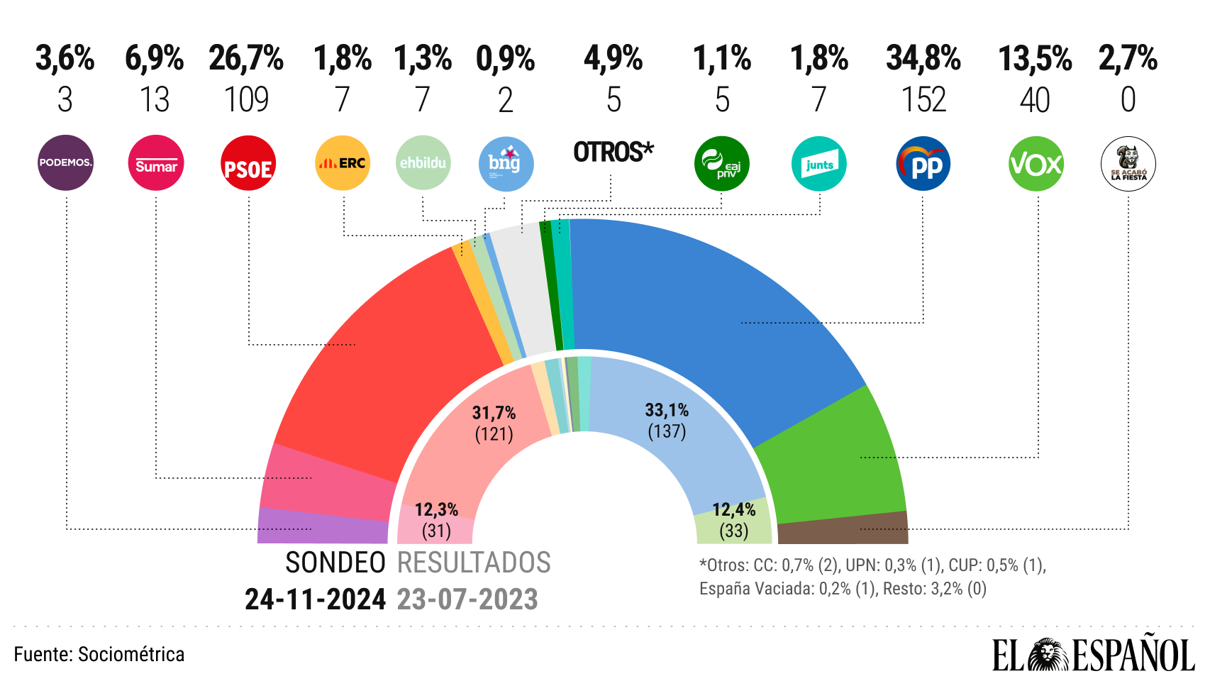 De este modo, el PP amplía a 8,1 puntos de intención de voto su ventaja sobre los socialistas: el partido de Alberto Núñez Feijóo obtendría hoy el 34,8% de los votos y 152 escaños.