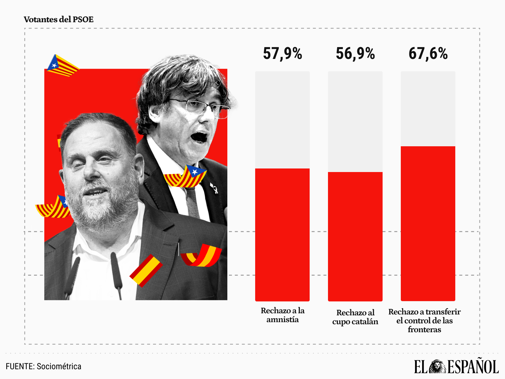 El mismo sondeo indica que los votantes del PSOE son extraordinariamente críticos con estas concesiones a los independentistas: el 57,9% rechaza la amnistía a Puigdemont y Junqueras, el 66,3% está en contra, también, de perdonarles el delito de malversación de fondos públicos.