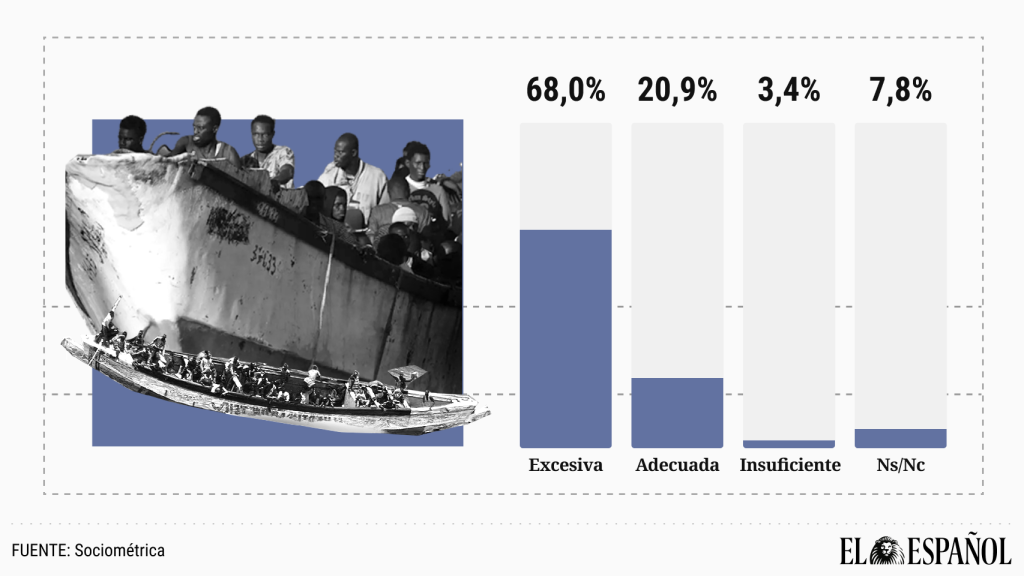 Sólo dos de cada diez piensan que la magnitud de la inmigración hoy es adecuada y se muestran conformes con las políticas en este ámbito. El resto, apenas un 1%, se dice indiferente. Así se desprende del último macrosondeo realizado por SocioMétrica para EL ESPAÑOL.