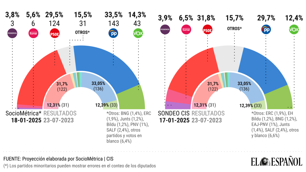 Y es que Sumar, con Podemos en la coalición, sacó 31 escaños el 23-J. Cinco de esos diputados pertenecían a la formación morada, que se separó de Yolanda Díaz poco después. Ahora, Sumar y Podemos acumularían solo nueve escaños.