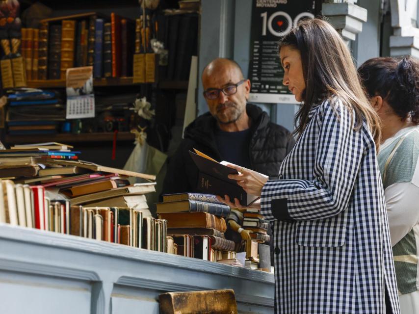 La reina Letizia consulta un libro en la Cuesta de Moyano, feria de libro viejo permanente de Madrid. Efe