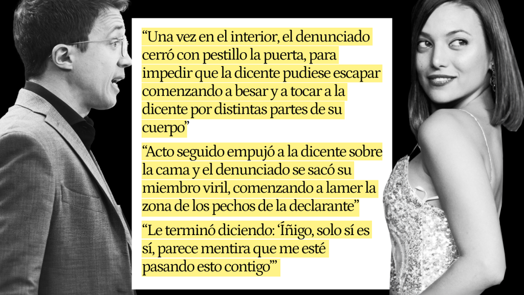 La denuncia expone que, tras la fiesta, presionada por el político, acuden a casa de éste. Allí, la intérprete habría comunicado a Errejón que se sentía muy incómoda ante la insistencia del político y preocupada por el estado de salud de su hija, que estaba enferma, por lo que, finalmente, le habría espetado: "Íñigo, sólo sí es sí. Parece mentira que me esté pasando esto contigo".