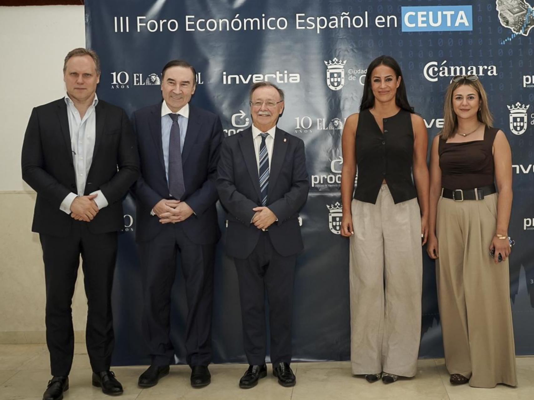 De izquierda a derecha; Stéphane Ruiz-Coupeau, director del campus de Málaga de ESSCA School of Management; Miriam Silva, técnica de Renfe y primera mujer comisaria técnica del Dakar; Ángel Recio, delegado de EL ESPAÑOL de Málaga; Ana Ramírez, directora de Cumlaude Soluciones de Formación; y Francisco José Gil Sánchez, director del Sepe en Ceuta; en la segunda jornada del III Foro Económico Español en Ceuta.