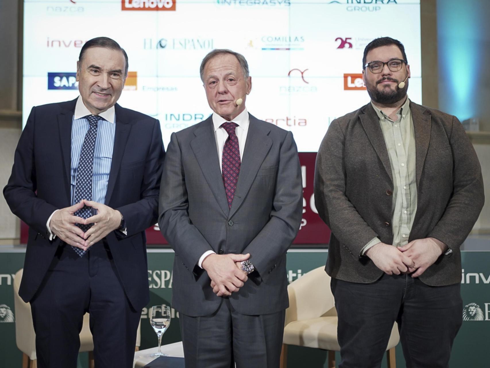 De izquierda a derecha; José Vicente de los Mozos, CEO de Indra; Yolanda Rodríguez, redactora jefe del Observatorio de la Defensa de EL ESPAÑOL; y Pedro J. Ramírez, presidente ejecutivo y director de EL ESPAÑOL; en la segunda jornada del I Observatorio de la Defensa 'La Defensa, una prioridad nacional'.