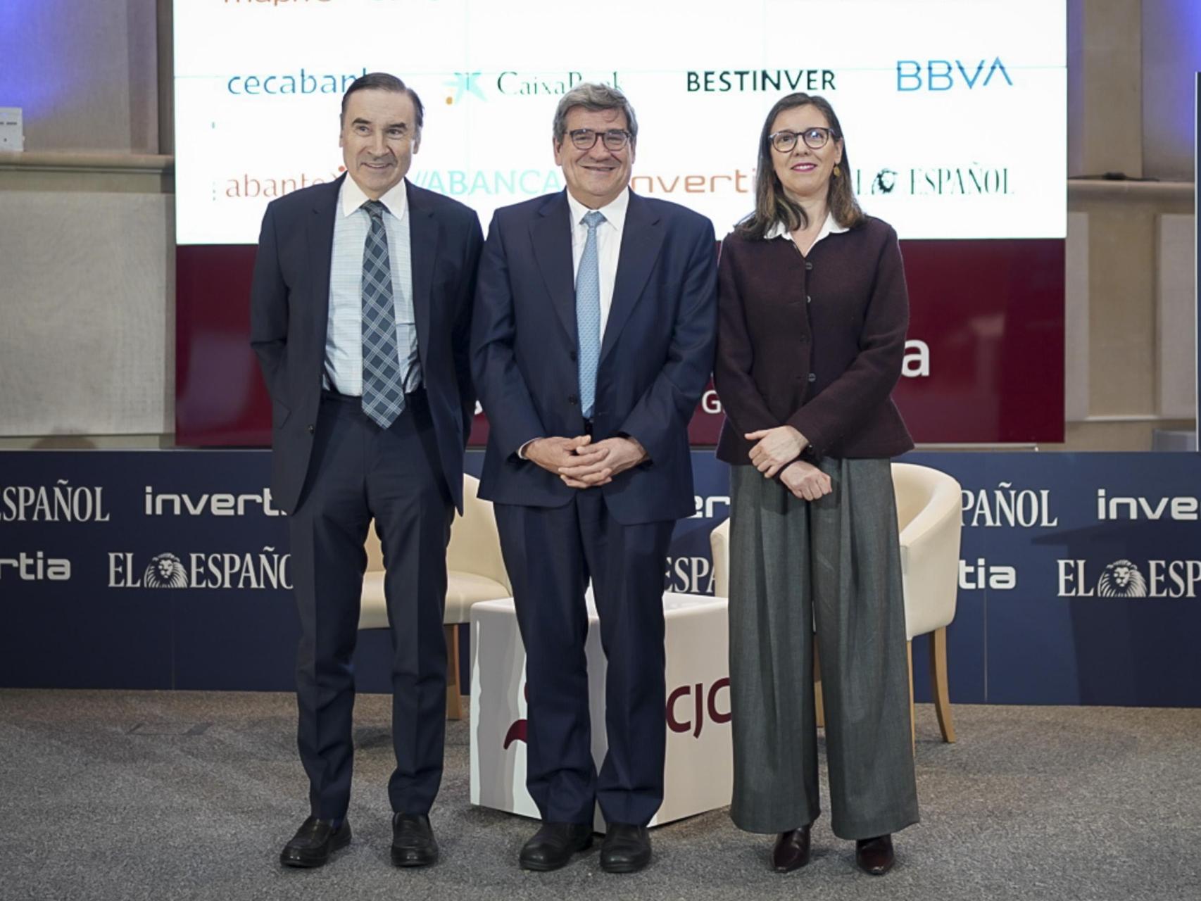 De izquierda a derecha; Alejandra Kindelán, presidenta de la Asociación Española de Banca (AEB); Pedro J. Ramírez, presidente ejecutivo y director de EL ESPAÑOL; y José Luis Escrivá, gobernador del Banco de España; en la apertura del VI Observatorio de las Finanzas.