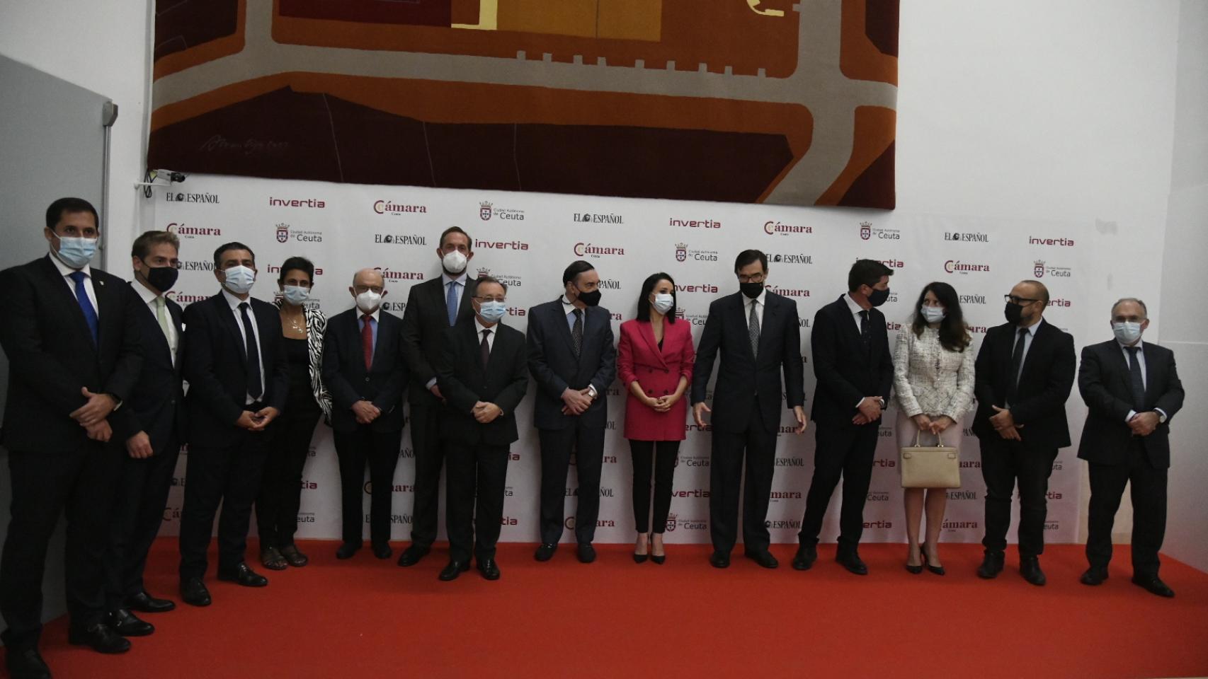 Juan Marín, vicepresidente de la Junta de Andalucía y consejero de Turismo de Andalucía; Pedro J. Ramírez, presidente ejecutivo y director de EL ESPAÑOL; Cruz Sánchez de Lara, vicepresidenta de EL ESPAÑOL; en la inauguración de la segunda jornada del Foro Económico Español 'Presente y futuro de Ceuta, su desarrollo empresarial'.