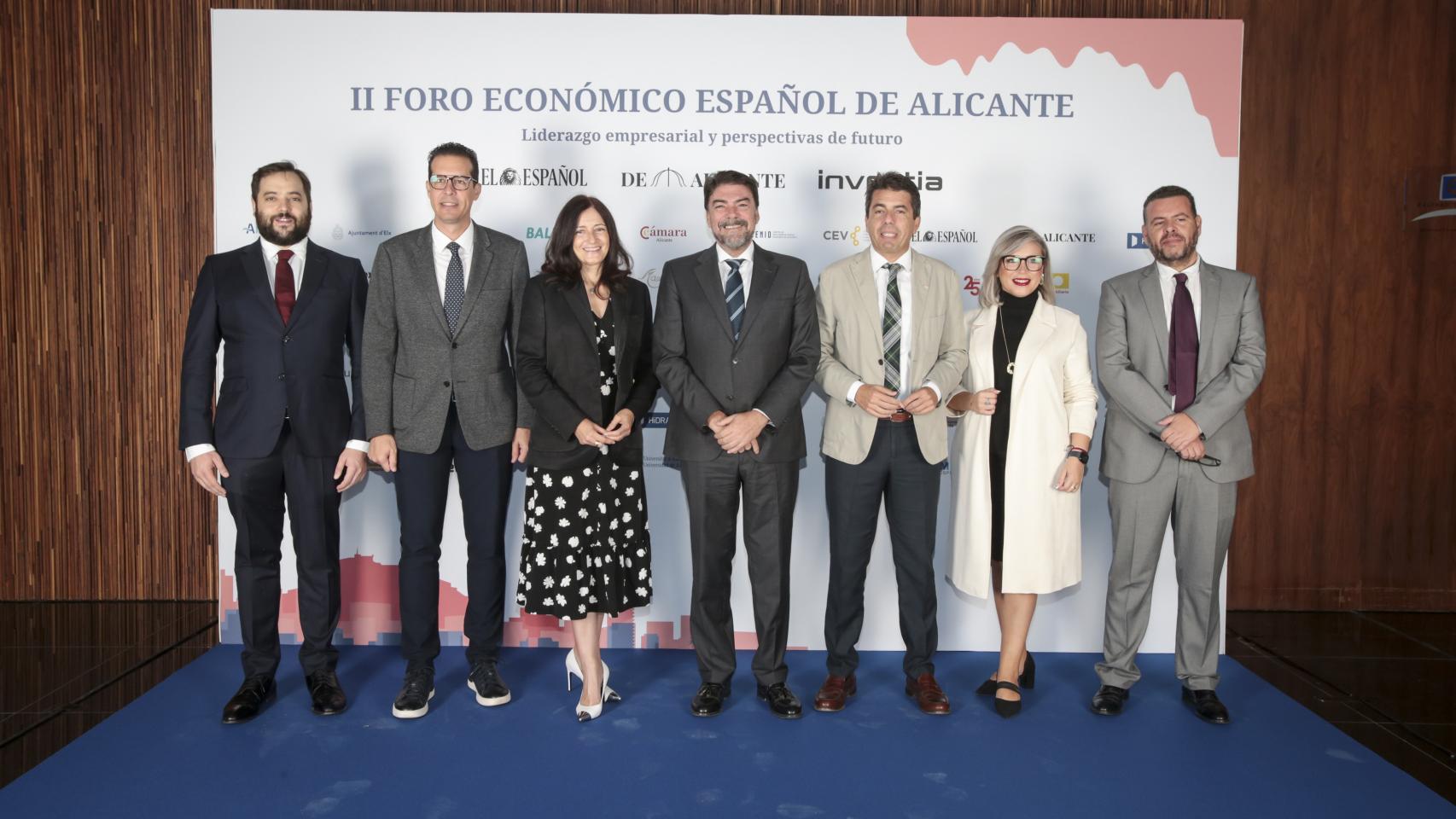 De izquierda a derecha; Marián Cano, presidenta de AVECAL; Arturo Criado, subdirector de EL ESPAÑOL-Invertia; Rubén Alfaro, alcalde de Elda y presidente de la FVMP; e Ignacio Amirola, presidente de Ineca; en el II Foro Económico Español de Alicante ‘Liderazgo empresarial y perspectivas de futuro’.