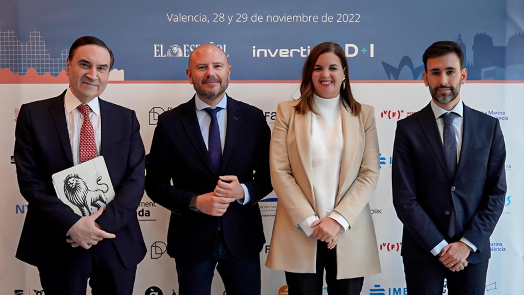 De izquierda a derecha; Enrique Izquierdo, director corporativo de Clientes de IMED Hospitales; Beatriz Aznar, redactora de D+I; Esther Donado, medical transformation lead de Boehringer-Ingelheim; y David Dapena, IT lead del Grupo Sanitario Ribera; en la primera jornada del Foro Económico Valenciano 'La economía de las oportunidades'.