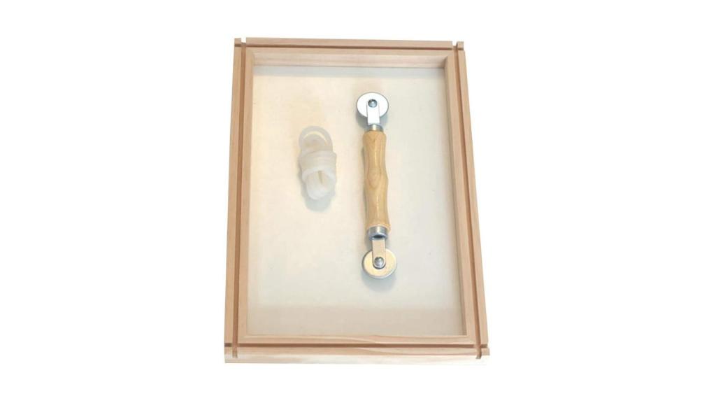 Prepara en el recipiente amplio vacío los bastidores, pon abajo el que tiene rejilla y arriba el que solo tiene el marco. Vierte la mezcla en el centro de la rejilla y reparte la pasta por toda ella, asegurántode de que queda bien plana y uniforme. Cuando esto sea así, retira el bastidor sin rejilla y deja secar durante una hora.