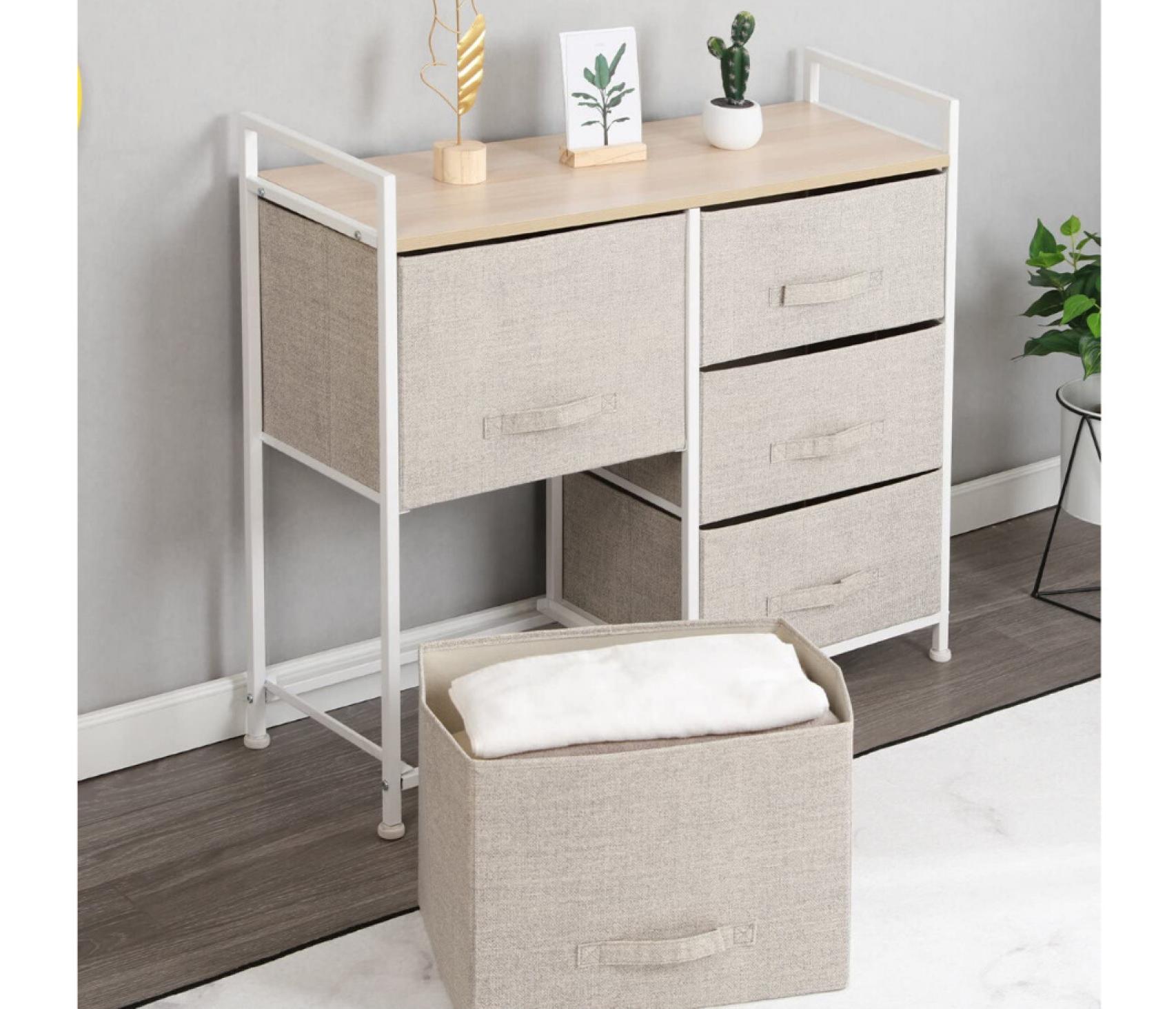 Este mueble tiene un diseño simple y moderno, que puede encajar con varios estilos de decoración. Está fabricado en madera y metal para una estructura robusta y los cajones son de tela rígida. Es ideal para guardar cualquier cosa, desde ropa que se pueda doblar, hasta complementos como cinturones o pañuelos e incluso juguetes si lo usas en un dormitorio infantil. Además en su parte superior podrás colocar elementos de uso diario que necesites tener más a mano o para colocar, por ejemplo, una lámpara o unas velas.