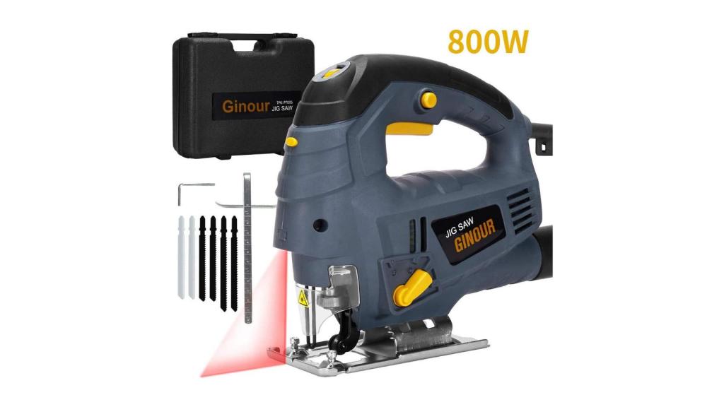 Esta sierra de calar se encuentra catalogada como la más vendida en su categoría dentro de Amazon. Algunas de las características que le hacen tener casi cinco estrellas de valoración son sus 800 vatios de potencia, su guía láser con regla, corte de curva exacto, biselado, inclinación ajustable y velocidad d o a 3000 SPM. Cuenta con siete velocidades y cuatro formas orbitales diferentes para cortar plástico, acero, acero inoxidable, aluminio, madera dura, contrachapado o cero con bajo carbono. Su empuñadura antideslizante cubierta de cuero suave lleva integrada una cubierta transparente que te protegerá del polvo y pizcas que se desprendan de los cortes. Se incluyen accesorios como llaves, hojas de sierra, adaptador de succión, manual de uso y garantía.
