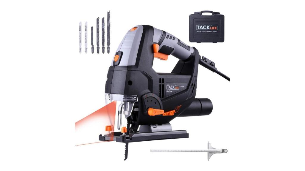 Otro de los modelos con grandes prestaciones a buen precio es este de Tacklife con 800 vatios de potencia, voltaje de 230 V, velocidad entre 800-3000 SPM y una profundidad de corte de 100 mm para madera y 10 para metal. Viene con una guía láser para ayudar a realizar cortes precisos y una luz LED que se pueden encender o apagar según convenga.
