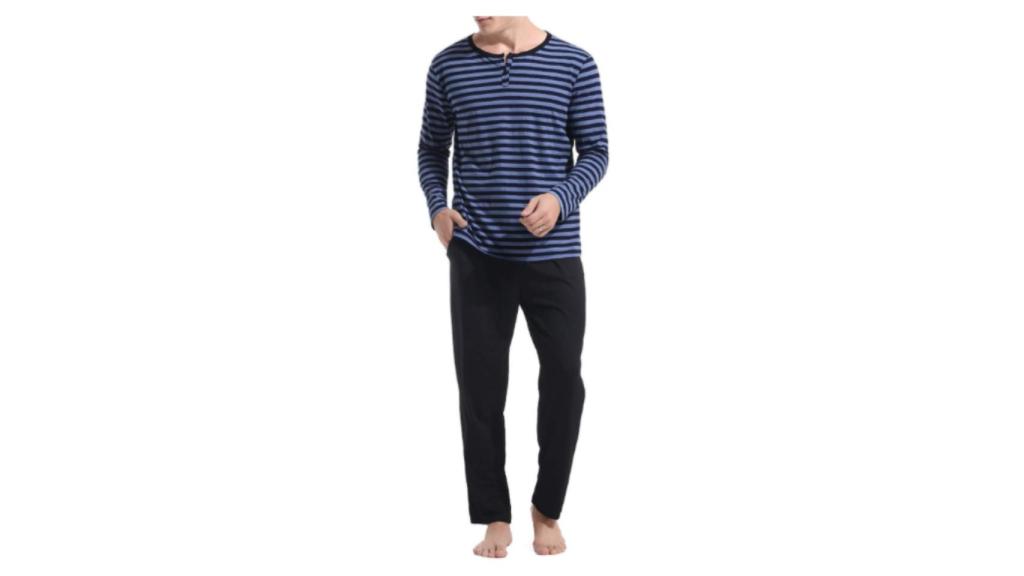 Otro modelo de pijama, este más pensado para hombre, también tene un diseño y un corte sencillo que abriga sin dar mucho calor, para que puedas dormir más o menos tapado según el tiempo que haga. También está hecho de algodón suave mezclado con poliéster para que tenga elasticidad y se pueda adaptar al cuerpo.